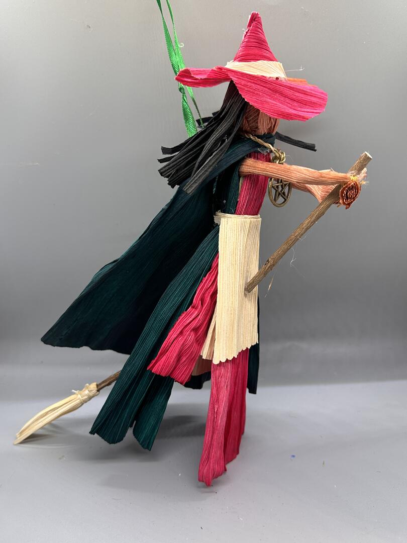 Kitchen witches are dolls that are typically hung in the kitchen or near the hearth to bring good luck to the house. These are made from hand-dyed corn husks and have a small packet of herbs inside them to provide protection, good health, and joy to the household. For additional whammy, the apron and face is blank so you can add your own glyphs or sigils with a pencil or felt tip pen. This one can sit atop a bottle, or be hung with the included ribbon.